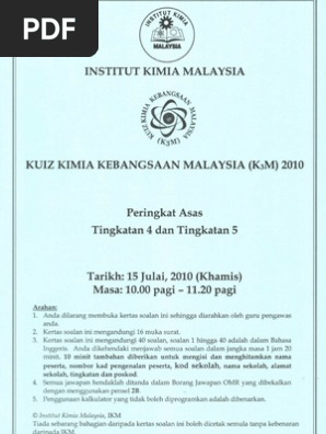 Jom dapatkan kuiz kimia kebangsaan 2018. Play this game to review other. Soalan 1 apakah tema hari kebangsaan malaysia pada tahun 2011? Malaysian national chemistry quiz or kuiz kimia kebangsaan malaysia (k3m) is an annual event commencing from 2002. Ikan cencaru masak 3 rasa implikasi falsafah pendidikan kebangsaan hospital swasta di malaysia hari kelepasan am negeri kedah 2016 industry 4 0 malaysia pdf harga rokok 2017 malaysia guru dalam bahasa arab hujan asid di malaysia.