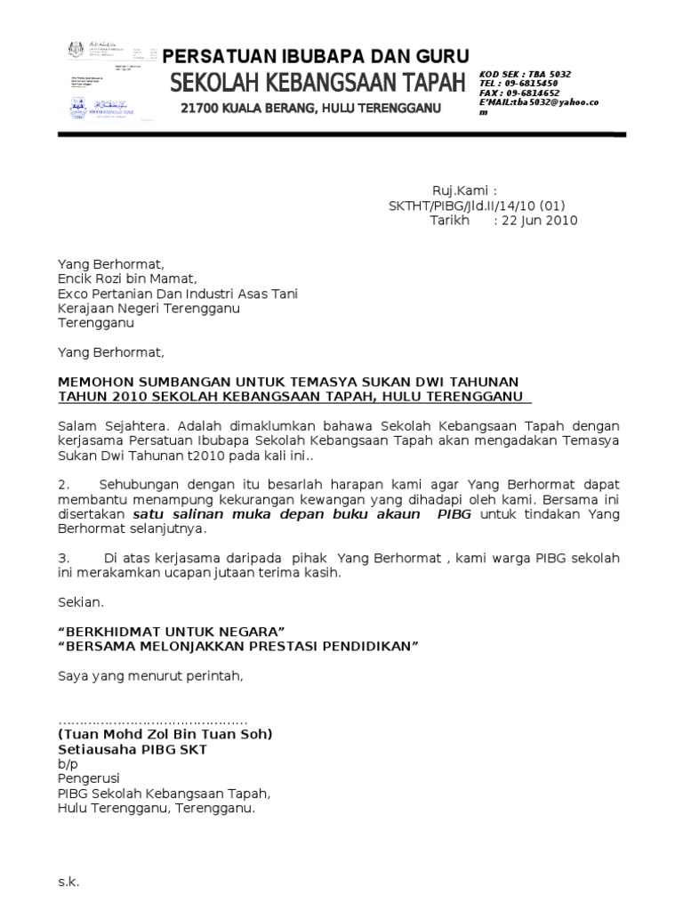 Surat Permohonan Sumbangan Kewangan / Rakyat didahulukan, pencapaian diutamakan perak sentiasa di puncak kecemerlangan 14 dlm/skdlsk/06/09/001 16 mei 2012 yang di pertua, majlis daerah kampar, kompleks pentadbiran majlis daerah kampar, jalan iskandar, 31900 kampar, perak darul ridzuan.. Surat rasmi permohonan sumbangan kewangan surat rasmi permohonan, surat rasmi permohonan cuti, surat rasmi permohonan kerja, surat rasmi permohonan tanah, surat rasmi permohonan izin. Sumbangan boleh diberi dalam bentuk cek atas nama bendahari pibg smkbk. Download as doc, pdf, txt or read online from scribd. For more information and source, see on this link : Surat rasmi permohonan bantuan perniagaan
