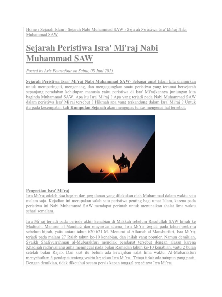 Dalam isra, nabi muhammad shallallahu alaihi wa sallam. Selain itu, ini adalah kekhususan nabi kita muhammad shallallahu 'alaihi wa sallam, karena hal ini tidak pernah terjadi kepada nabi dan rasul selainnya (sebelumnya). Kejadian ini merupakan salah satu peristiwa penting bagi umat islam, karena pada peristiwa inilah beliau mendapat perintah untuk menunaikan salat lima waktu sehari semalam. Kemudian pada malam itu juga, beliau diajak menuju langit dunia dan inilah peristiwa mi'raj, yakni perjalanan dari baitul maqdis menembus tujuh lapis langit dunia. Hadis peristiwa isra' mi'raj nabi muhammad saw. Peristiwa israk mikraj dan masalah mukjizat lainnya hanya dapat didekati melalui pendekatan keimanan, sedang. Selain isra' dan mi'raj masih banyak peristiwa bersejarah yang terjadi di bulan rajab. Peristiwa isra' mi'raj adalah salah satu peristiwa yang agung dalam perjalanan hidup nabi muhammad shallallahu 'alaihi wa sallam. Sebagian orang meyakini bahwa peristiwa ini terjadi pada tanggal 27 rajab. Nizhami, rekan senegara 'aththar, menyuguhkan dalam. Peristiwa isra mi'raj diperingati oleh umat muslim setiap tanggal 27 rajab untuk mengenang cerita perjalanan spiritual nabi muhammad saw dari masjidil haram ke masjidil aqsha hingga ke sidratul muntaha di langit ketujuh. Kejadian israk dan mikraj juga adalah untuk menguji umat islam (apakah percaya atau tidak dengan peristiwa. Isra dan mi'raj merupakan salah satu peristiwa penting bagi umat islam, karena pada peristiwa ini nabi muhammad saw mendapat perintah untuk menunaikan shalat lima waktu sehari semalam.isra mi'raj terjadi pada tanggal 27 rajab tahun 11 kenabian.