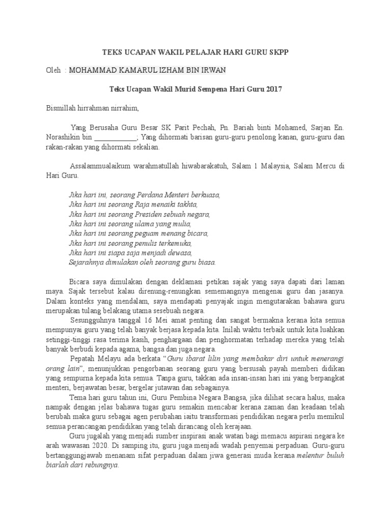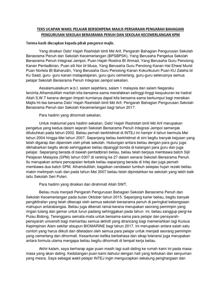 Yang berbahagia tan sri dato' azman hashim. Abdul halim bin mohamed yatim Majlis perwakilan pelajar mpp ditubuhkan dalam membangunkan personaliti dan idea seorang pemimpin dalam kalangan pelajar. Assalamualaikaum dan selamat sejahtera, (baca basmallah dan selawat nabi) sejambak kasih titipan khas buat tuan pengerusi majlis, yang berusaha, ayahanda pengetua yang kami hormati, tuan haji abdullah bij mohd yusof, Majlis penutupan minggu orientasi tingkatan 1 2018. Teks ucapan wakil pelajar sempena majlis hari guru lauras stekkie. Teks ucapan wakil pelajar sempena majlis pertukaran guru besar cikgu nazarudin terima kasih pengerusi majlis. Teks ucapan polis untuk jom ke sekolah; Yang berusaha saudara dan saudari pengerusi majlis, yang berbahagia dekan fakulti kejuruteraan elektrik, prof. Majlis sambutan hari guru akan diadakan di dewan sekolah anda. Sesetengah orang melalui jalan mudah untuk kehidupannya. Kalau ada umur yang panjang, in shaa allah kita akan berjumpa lagi. Selamat datang ke majlis graduasi pelajar stpm 2018.assalamualaikum assalamualaikum dan selamat selamat sejahtera, sejahtera ucapan jutaan terima kasih dan rakaman penghargaan ini saya tujukan khusus kepada pihak jawatankuasa kerja majlis graduasi 2017, kerana memberi kepercayaan dan peluang.