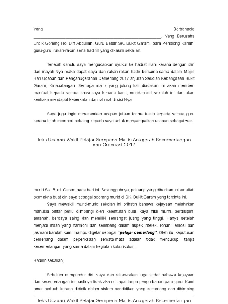 Teks ucapan perasmi sempena majlis gradusi pelajar 2014 smk sijangkang jaya yang dihormati tn hj zulkapli bin mat taib ydp pibg smk sijangkang jaya yang berusaha pn hajah salbiah bt ibrahim pengetua smk sijangkang jaya yang dihormati barisan kepimpinan penolong kanan pn. Ucapan wakil murid ( majlis restu ilmu ) assalamualaikum wbt dan selamat sejahtera, sejambak kasih titipan sayang buattuan pengerusi majlis,yang berusaha tuan guru besar tuan haji mansur bin hussain,penolong kanan pentadbiran puan norhasni bt. Azam untuk membina masa depan yang lebih cerah. Segala sumbangan dan pengorbanan cikgu di sekolah ini akan sentiasa dikenang. Pengetua smk kampung baru si rusa 4. Assalammualaikum w.h.t dan salam sejahtera…. Ismail,penolong kanan hal ehwal murid en. Ketahuilah cikgu, di setiap hari dari setiap 69 orang calon spm 2012 ini, tersemat keinginan untuk berjaya. Teks ucapan wakil pelajar sempena majlis perpisahan guru. Doc teks ucapan wakil pelajar nurul izzah hazirah ii academia edu for more information and source, see on this link : Teks ucapan wakil murid graduasi tahun 6. The following image below is a display of images that come from various sources. Yang diraikan encik nazarudin, guru besar sk bakap indah, yang dihormati _______________________________ yang dipertua pibg yang dihormati guru penolong kanan pentadbiran encik shukri, guru penolong kanan hal ehwal murid puan halimah, guru.
